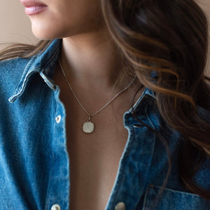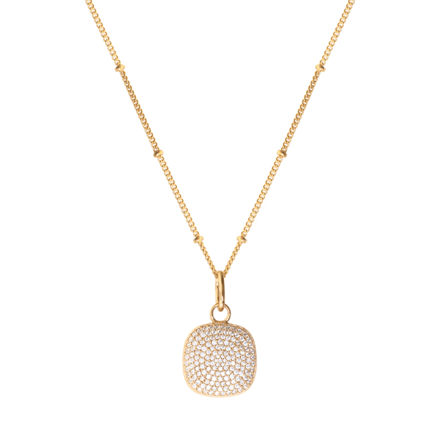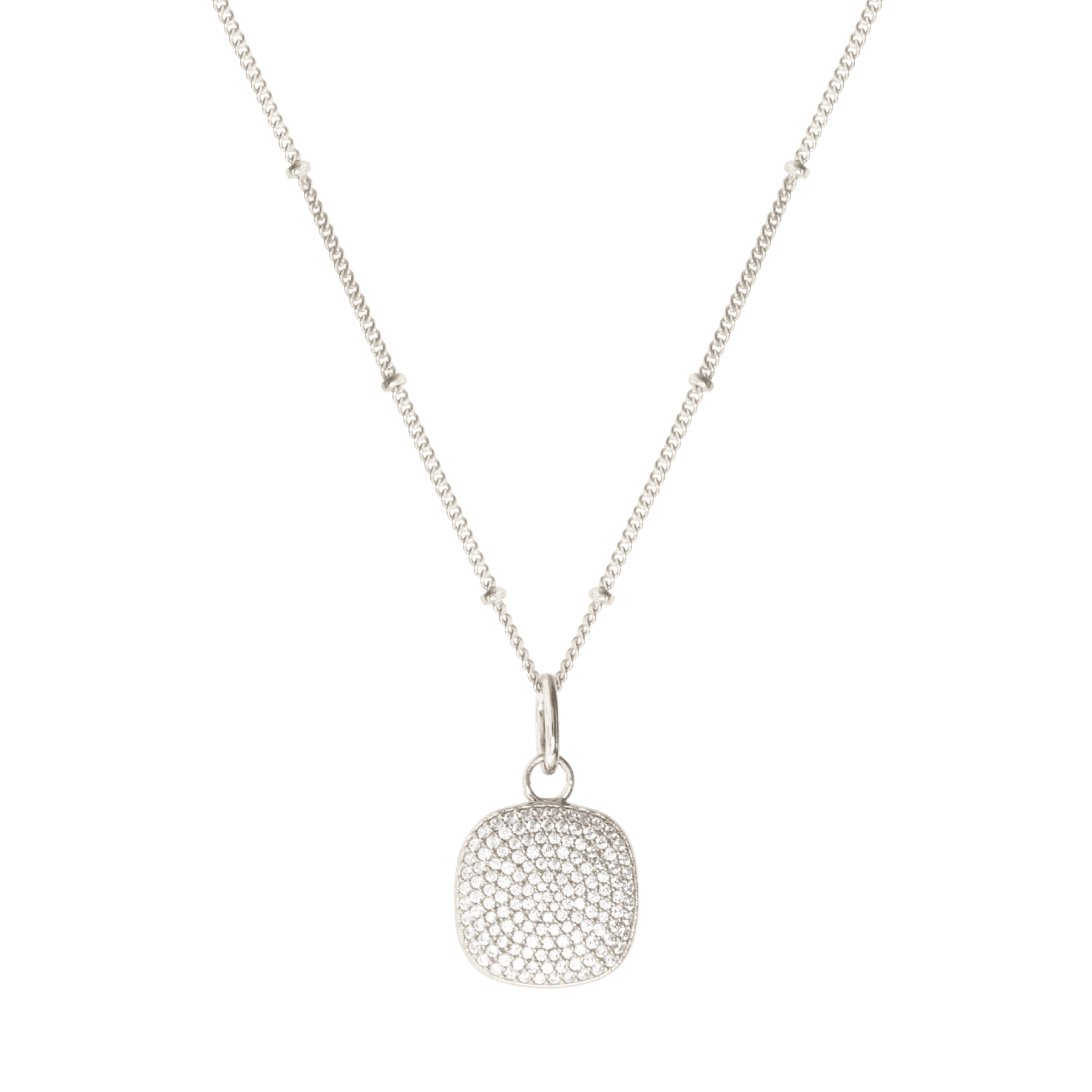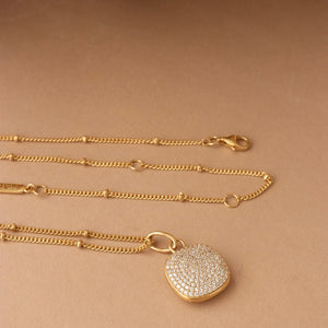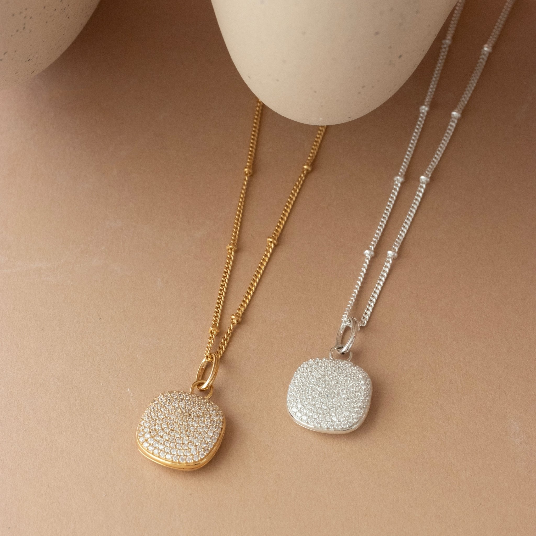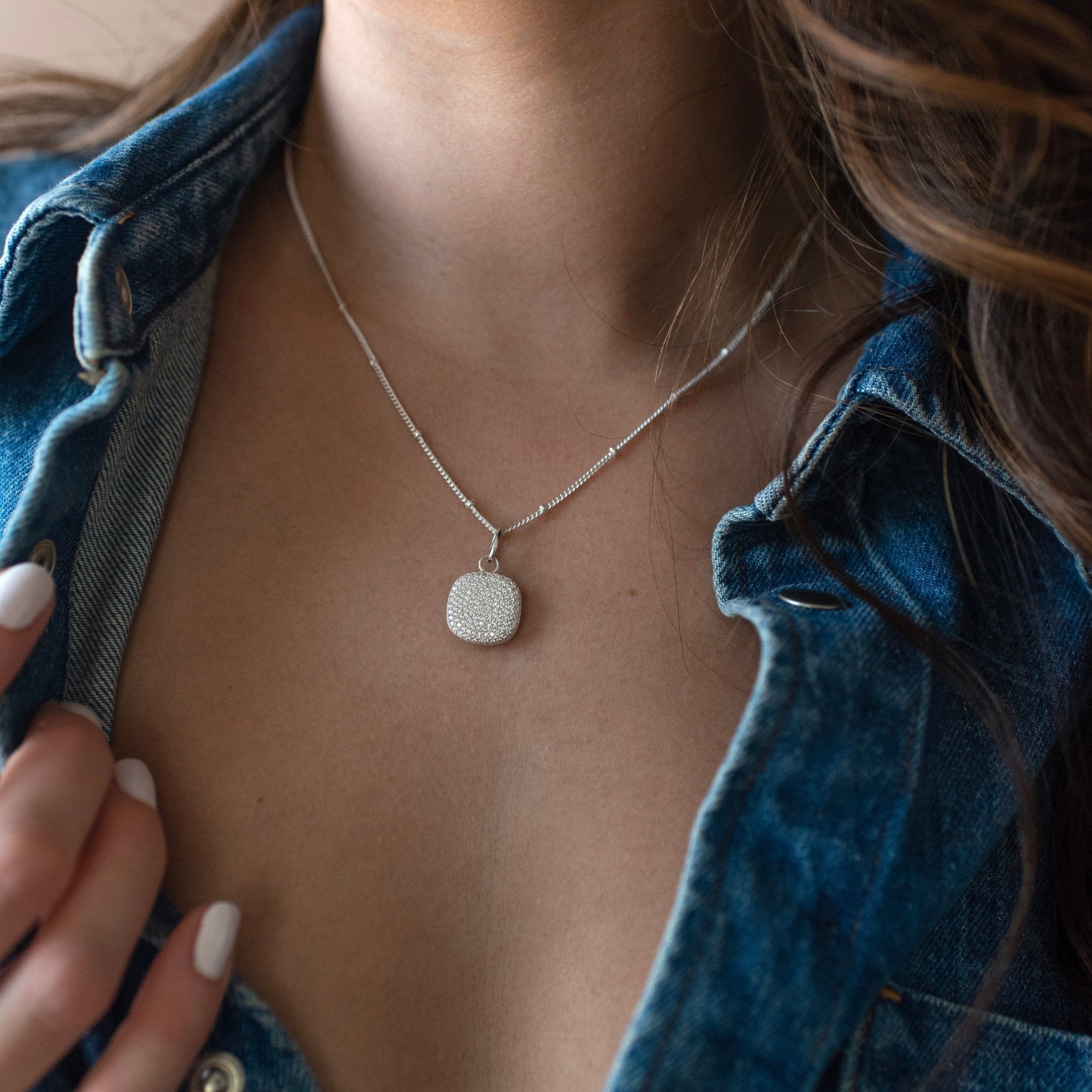 This pavé sculpted square locket necklace is a modern keepsake designed to shine with meaning. Featuring a softly contoured square locket inlaid with sparkling cubic zirconia stones, this piece brings elegance and sentiment together in a refined silhouette. The locket is suspended from a delicate beaded cable chain and is designed to slide on and off, allowing you to customize your look or wear it across different chains. Thoughtfully crafted as part of our Sculpted Metal Series, it is a timeless piece made to hold what matters most.