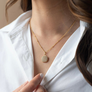 1 mm beaded cable chain and the locket pendant is removable from the chain. Wear it close to the collarbone or adjust the length (at 16", 18" or 20") for effortless layering. Want even more length? Purchase and extender here.