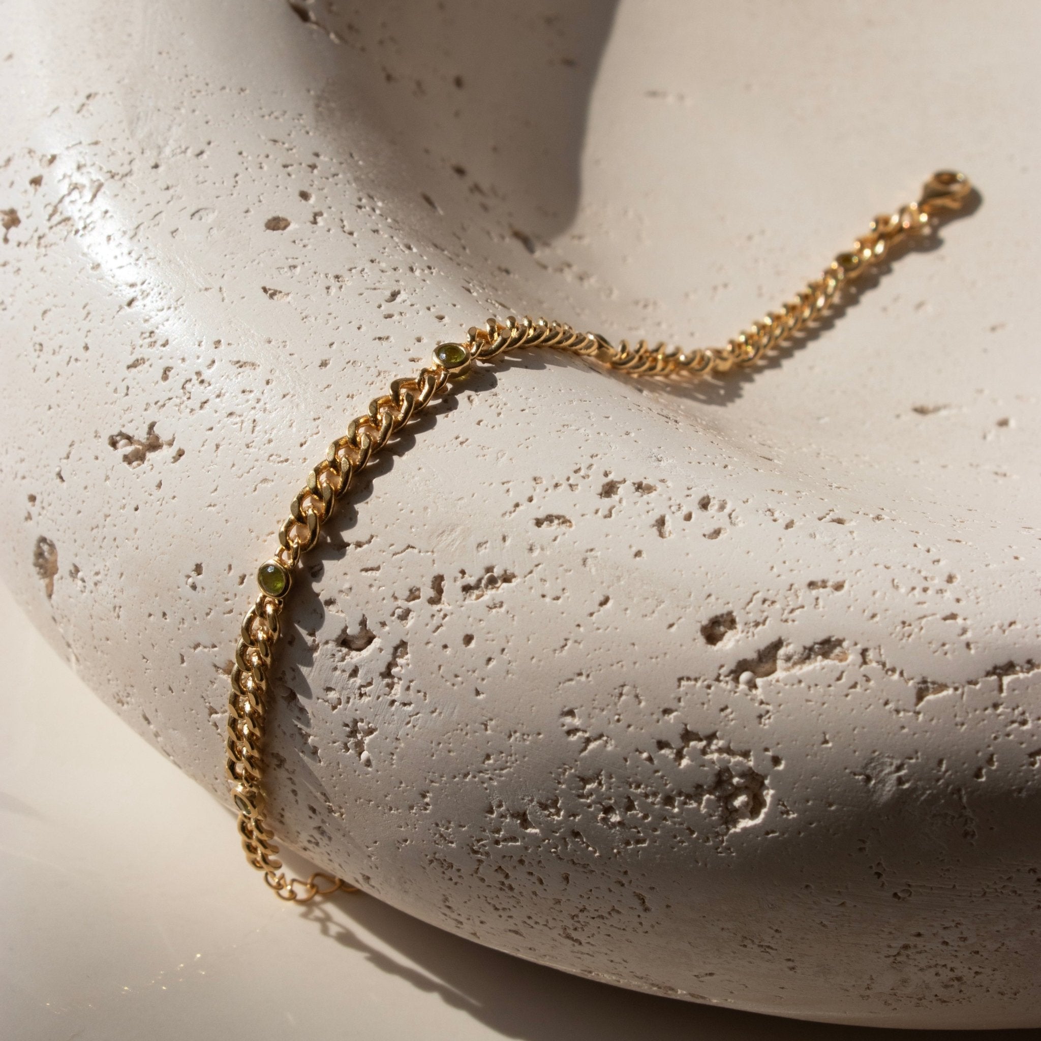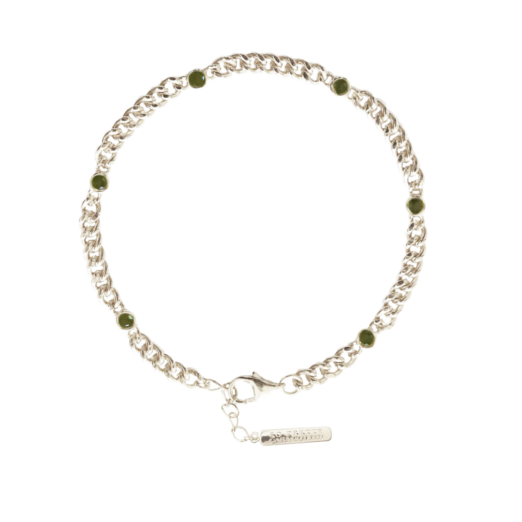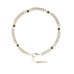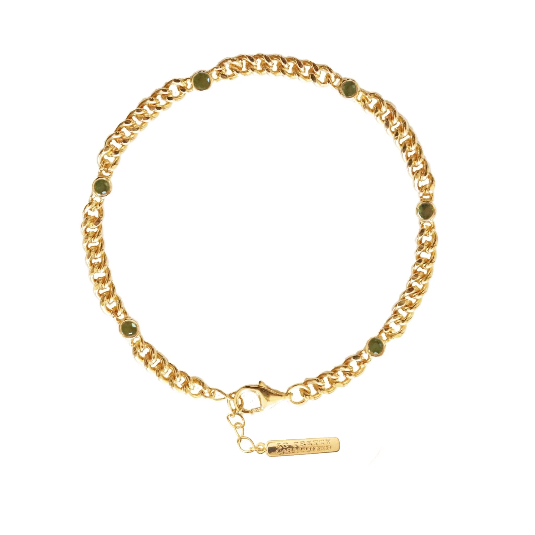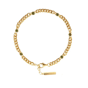 A luxe staple you'll wear day after day, this curb chain bracelet features 6, 2.5 mm size juniper vasonite stones along the length and is made of 18K gold vermeil or solid 925 sterling silver. 6.5" to 7.5" long and includes1" extender. The chain is 3mm thick. It is also nickel-free and perfect for those with skin sensitivities.