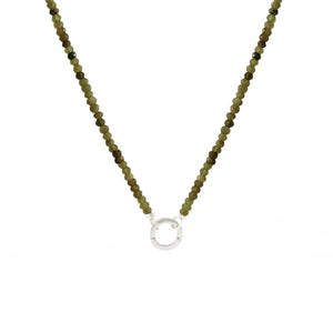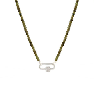 This juniper vasonite beaded necklace has loops at the end to attach a connector clasp at the front. Choose from a carabiner style, oval, crystal round, or all-metal round clasp.