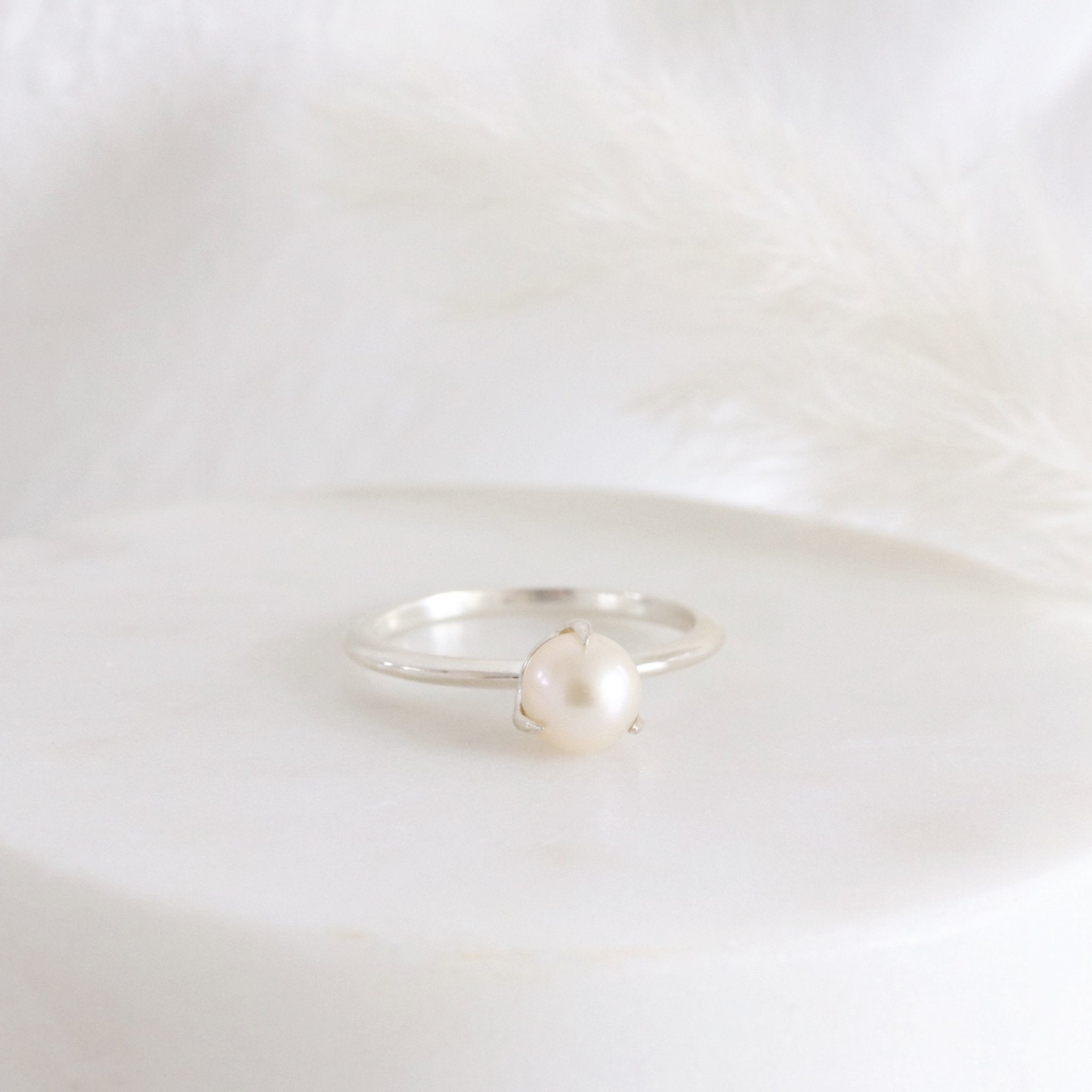 A mainstay in your jewelry box and inspired by classic Audrey Hepburn style, this solitaire ring features a freshwater pearl and measures 6 mm in size.