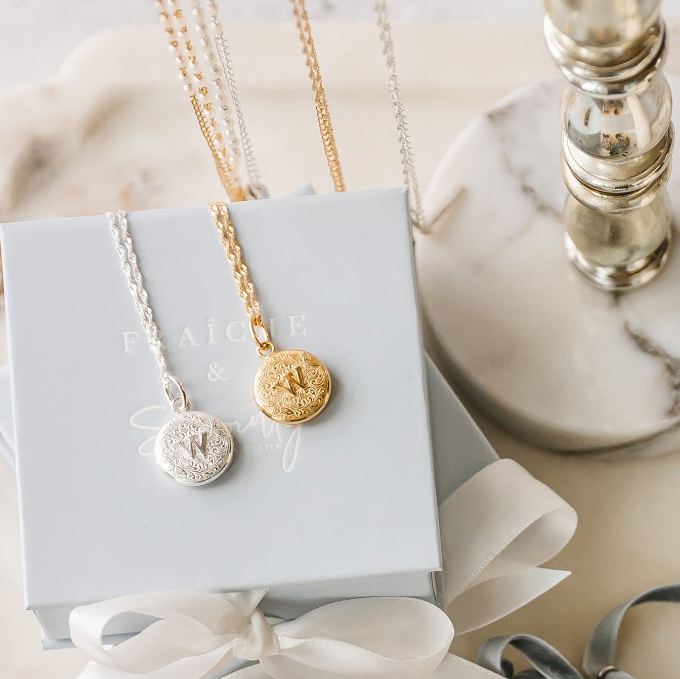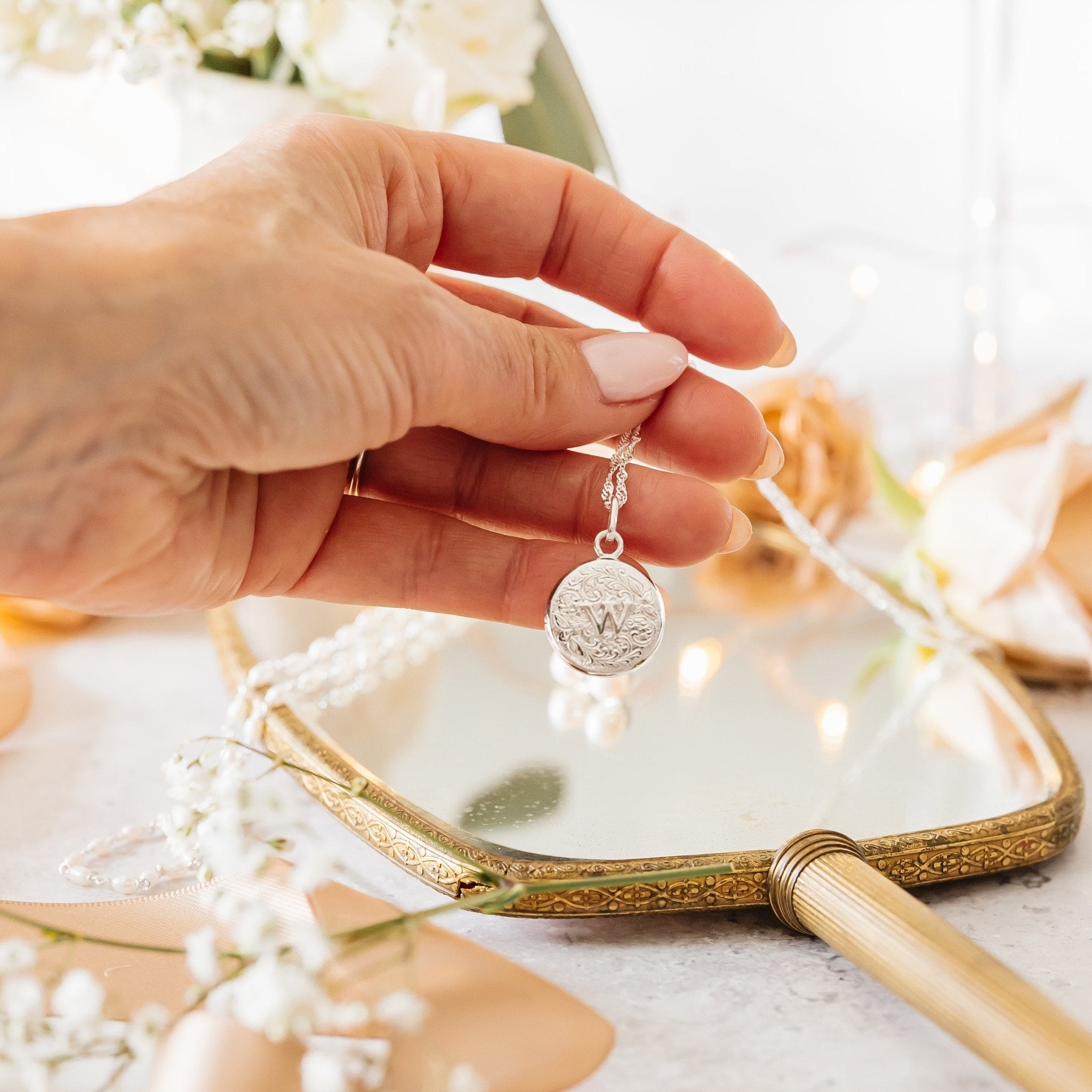 Celebrate your story or give a meaningful gift with this vintage monogram locket that’s personalized with your letter or theirs. Whether it’s your initial, a loved one’s, or a family name that holds meaning, this locket is designed to hold what matters most: memories, photos, and keepsakes close to your heart. It isn't just jewelry, it's a sentimental statement and heirloom made to be cherished for years to come. Each locket comes with a monogram postcard, perfect for adding a handwritten message or framing as a keepsake.