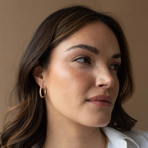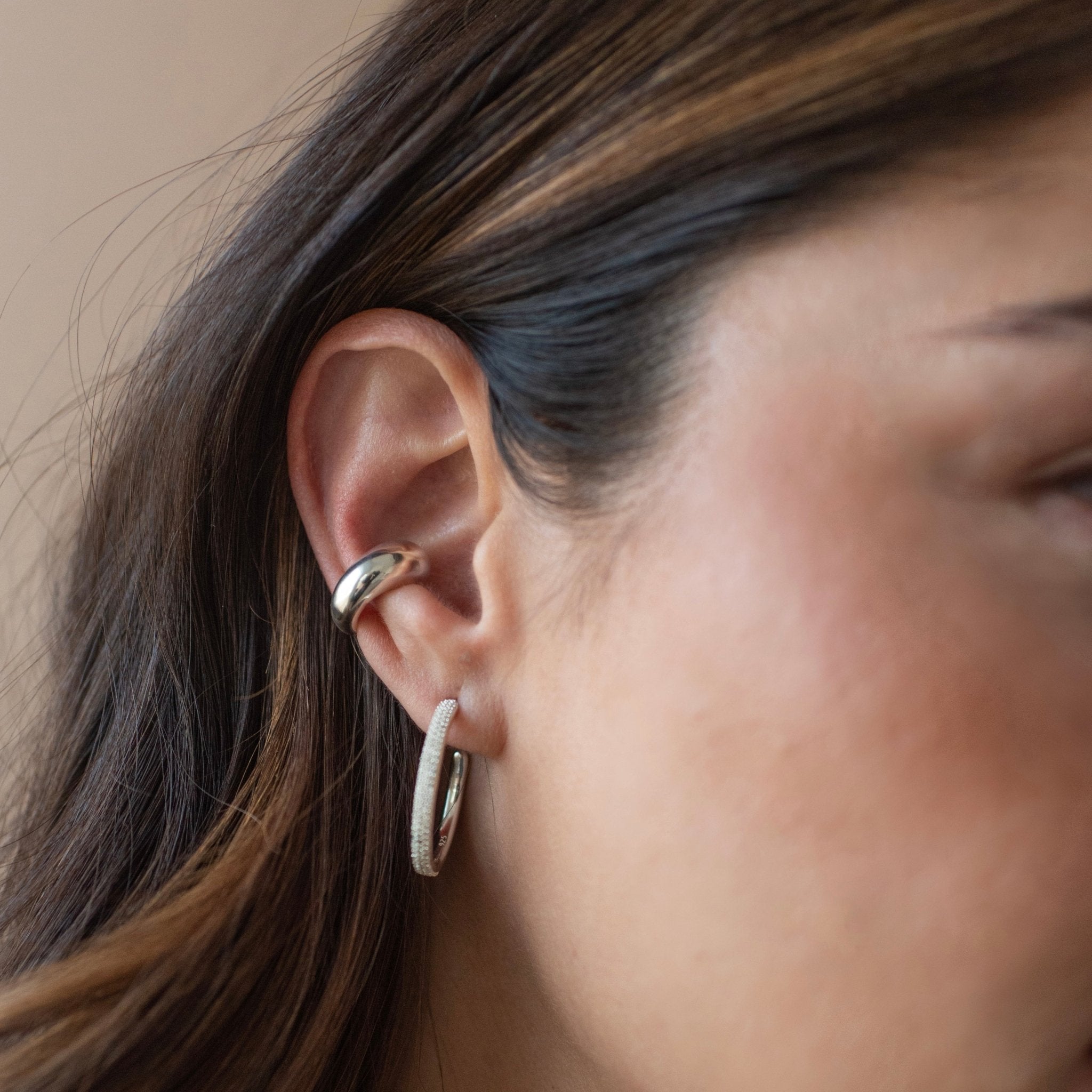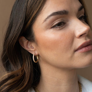 With a 26 mm diameter, they offer a classic hoop shape with modern presence, balancing elegance and impact. Part of our Sculpted Metal Series, they are designed to elevate both everyday looks and special occasions with effortless shine.