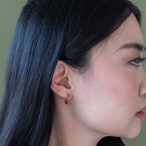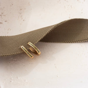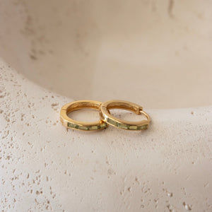 Everyday wear to wedding-worthy and inspired by modern royalty these sleek huggies feature 4 juniper vasonite baguette stones along the length, measure 11 mm in diameter, and are made of 18K heavy gold plated vermeil over solid 925 solid sterling silver. They are also nickel-free and are perfect for those with metal sensitivities.