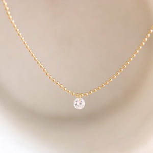 Created with light and joy in mind, this ultra dainty pendant necklace features a single 3 mm diamond cut cubic zirconia stone on a delicate yet strong 1 mm ball chain and includes 3 optional length loops at 14", 16", or 18". It is made of 18K heavy gold plated vermeil over solid 925 sterling silver or solid 925 sterlin silver.The silver is also nickel-free so is perfect for those with metal allergies. We love how this delicate necklace can be worn solo for a subtle touch of elegance or layered with pendants, and other pieces from our collections.