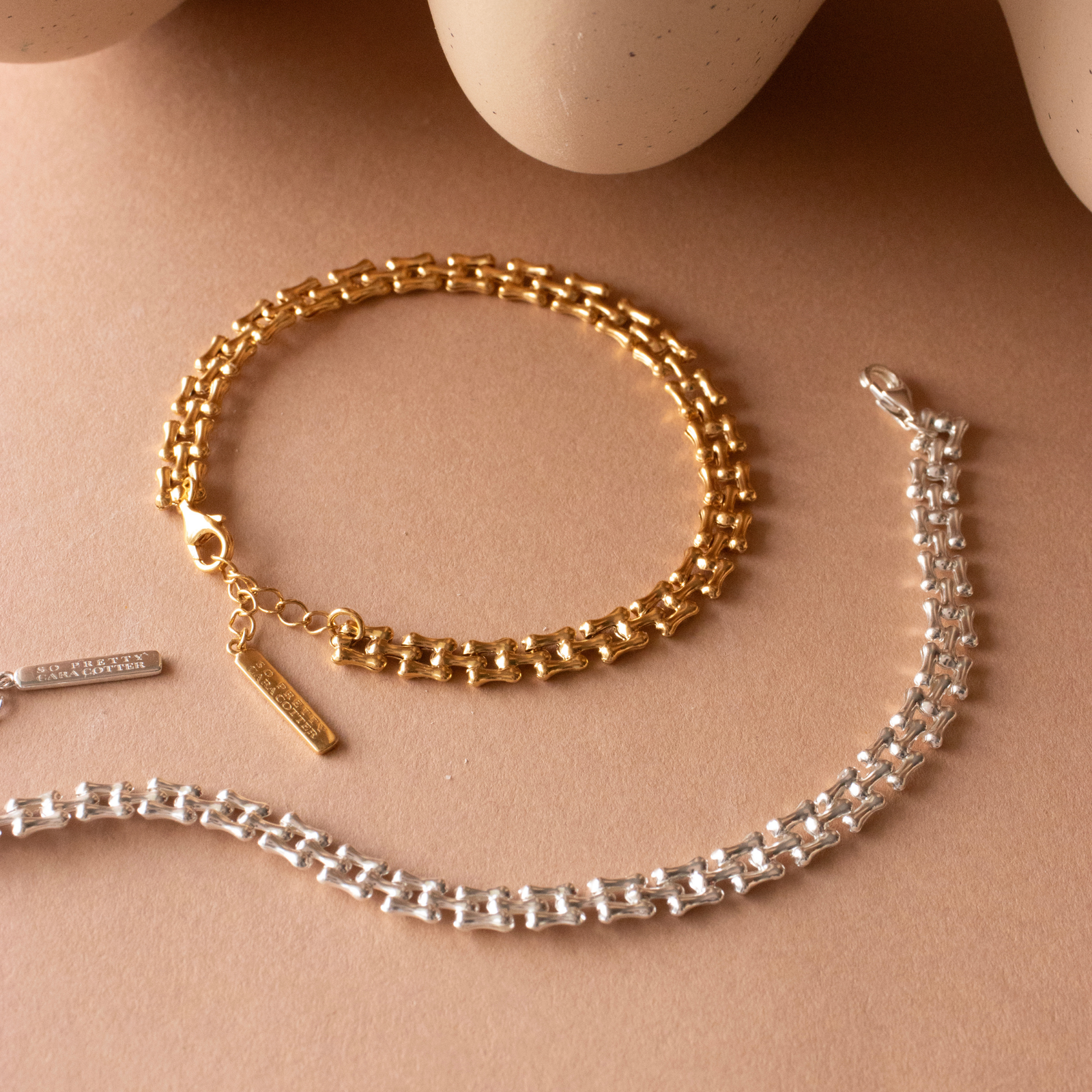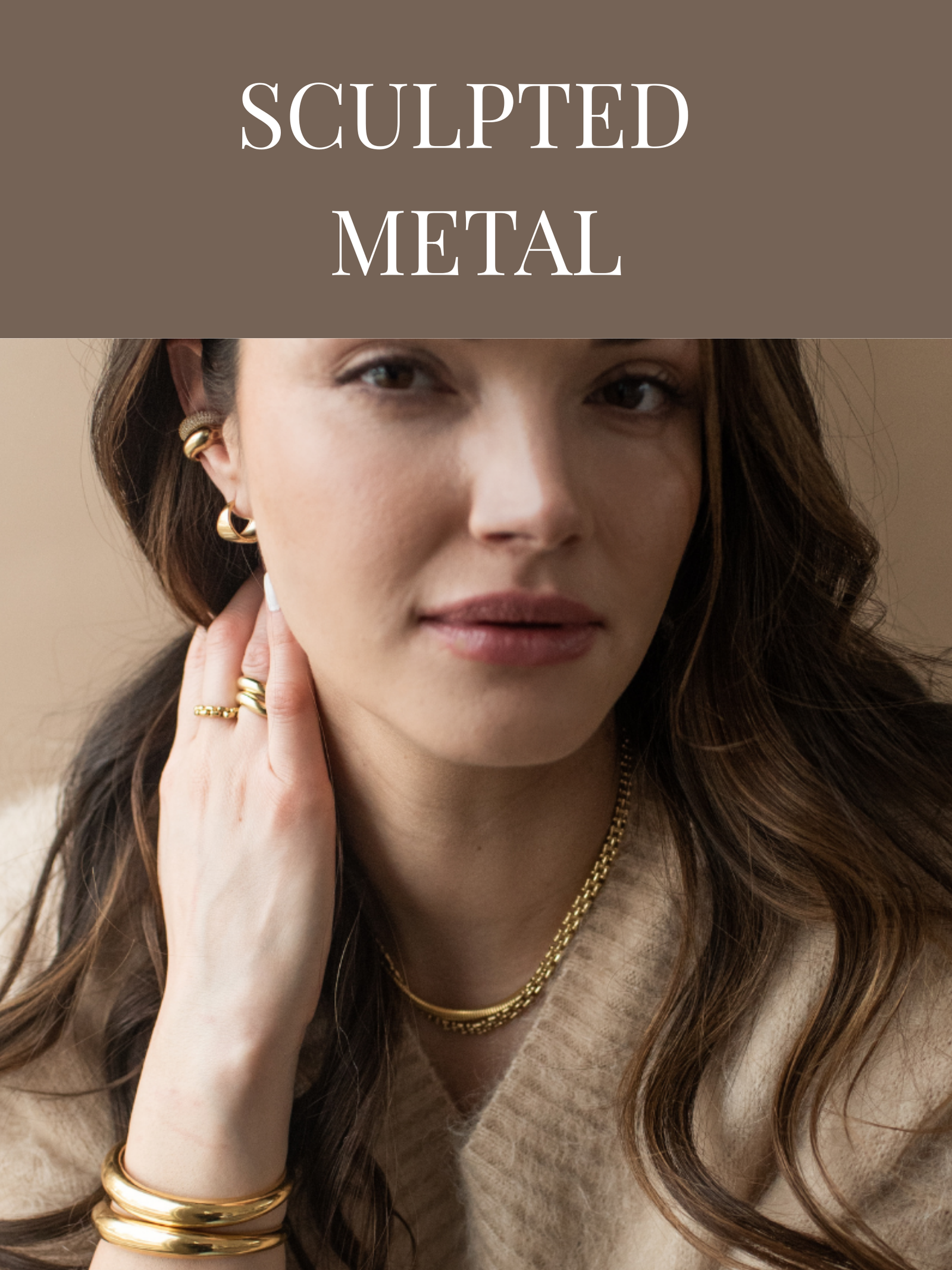 Features dimensional volume jewelry that feels substantial yet fluid on the body. From interlocking chains with architectural rhythm to smooth hollowed forms that catch the light from every angle, these pieces are all about presence without excess.