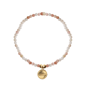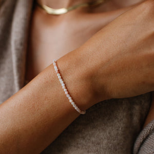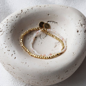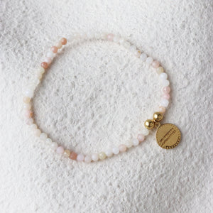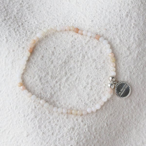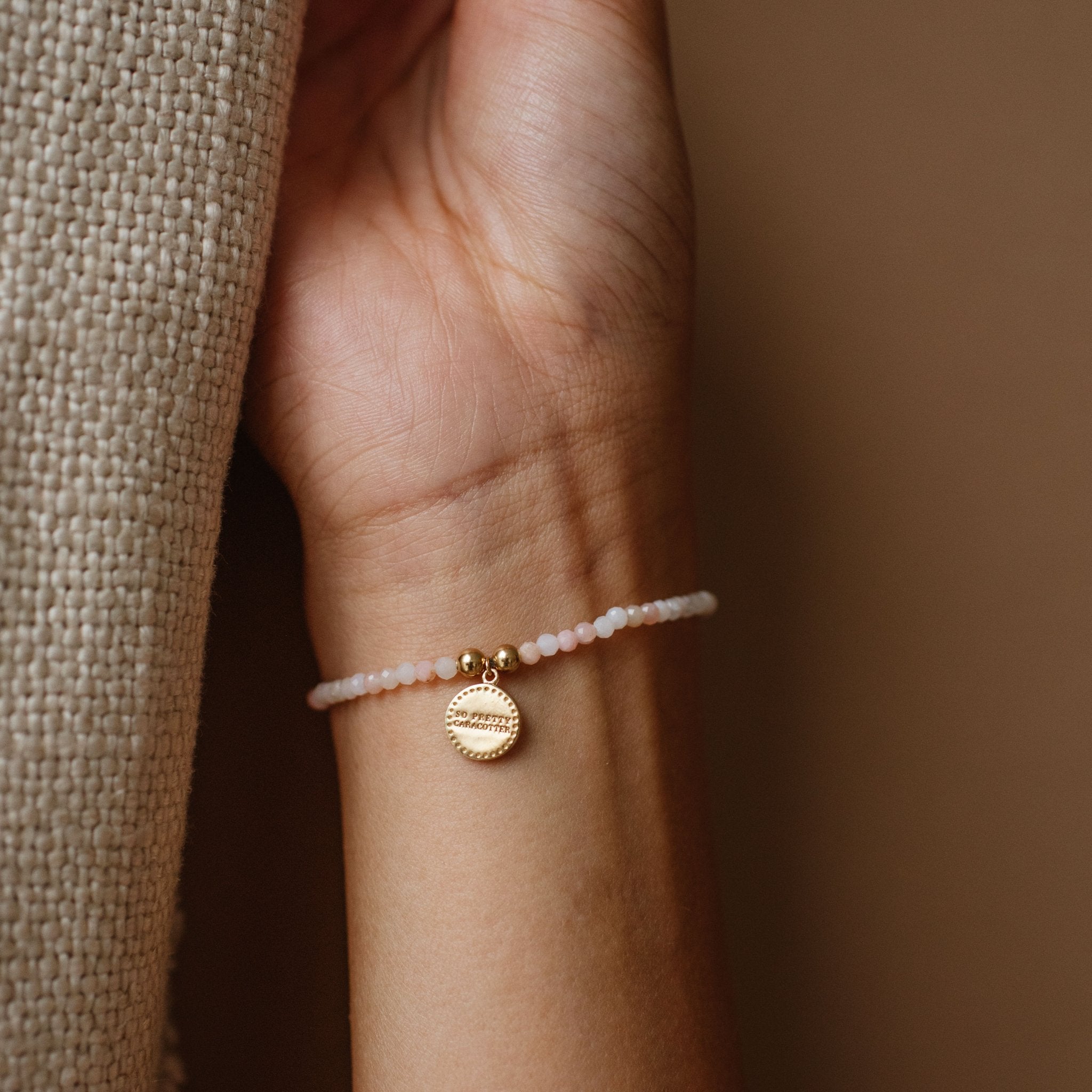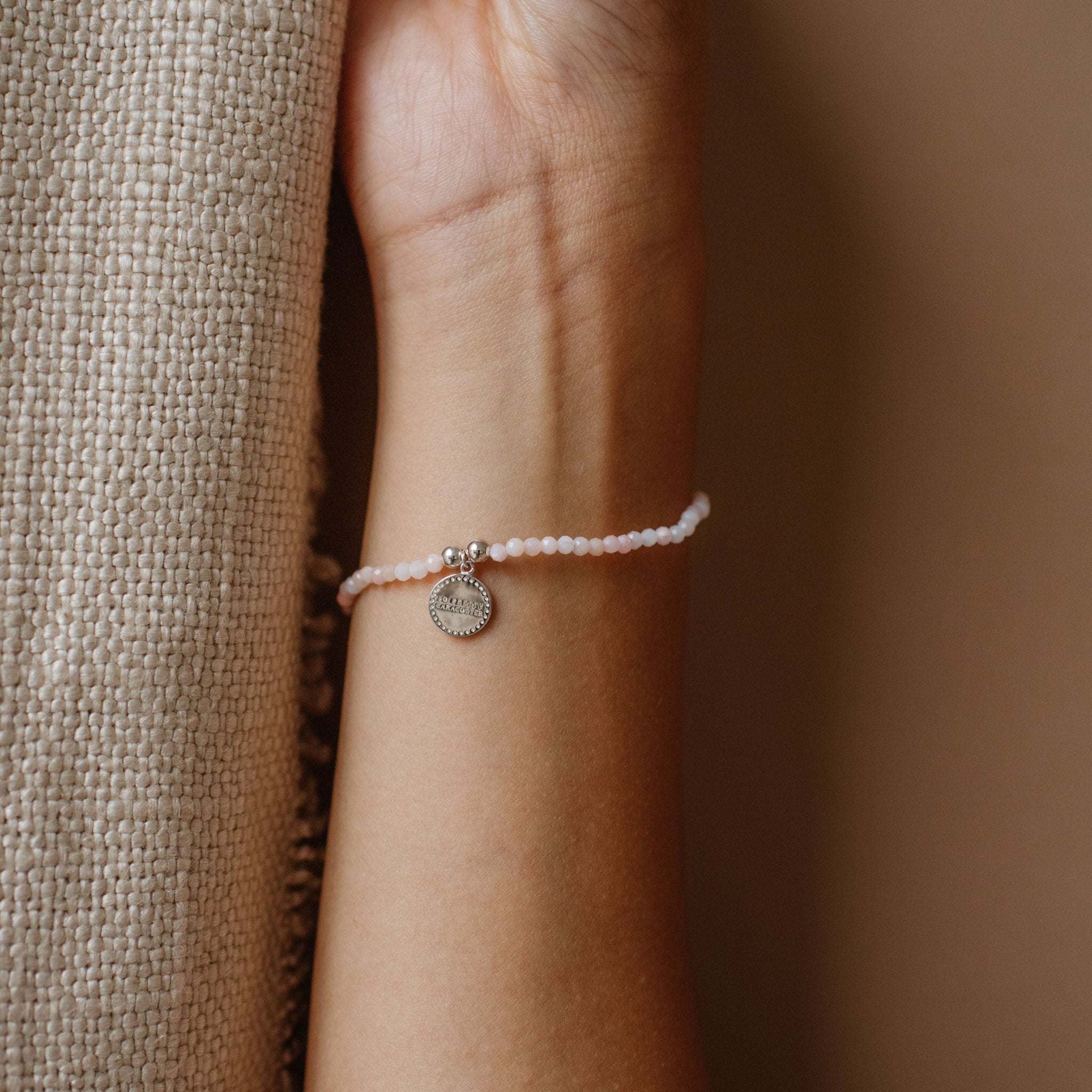 Available in three sizes, this elevated stretch bracelet features faceted 3.5 mm round pink opal beads and is available in 6", 6.5" or 7" diameters and is adorned with 18K gold vermeil or sterling silver accent beads and logo tag. It is also nickel-free making it perfect for those with metal sensitivities.
